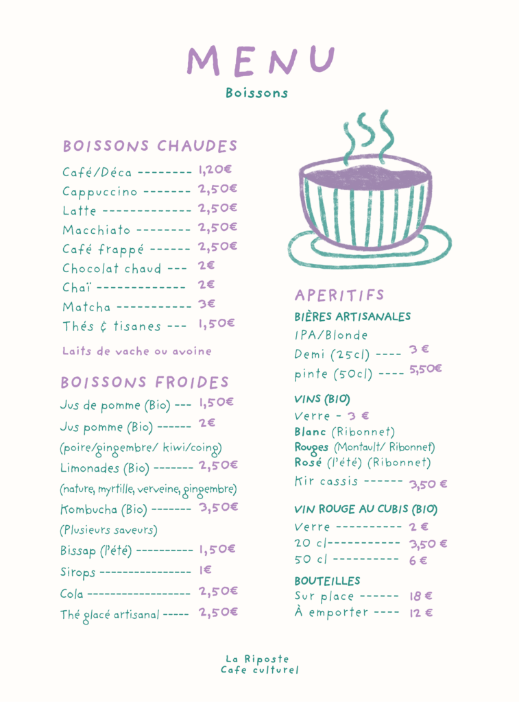 Bienvenue à la table de La Riposte. Nous vous proposons une cuisine bio et locale, préparée avec soin.